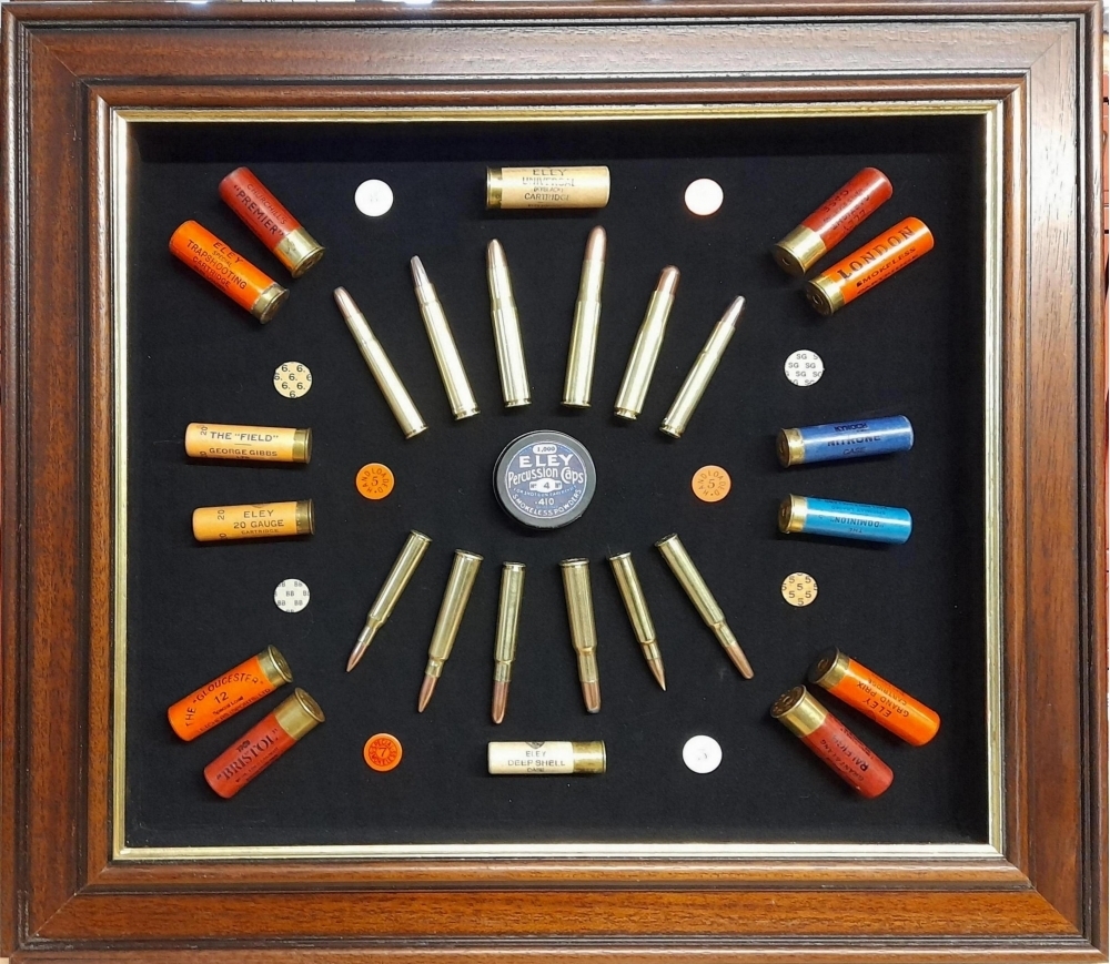Housed in an attractive 64mm antique frame on black baize background and containing over shot cards and a primer tin.