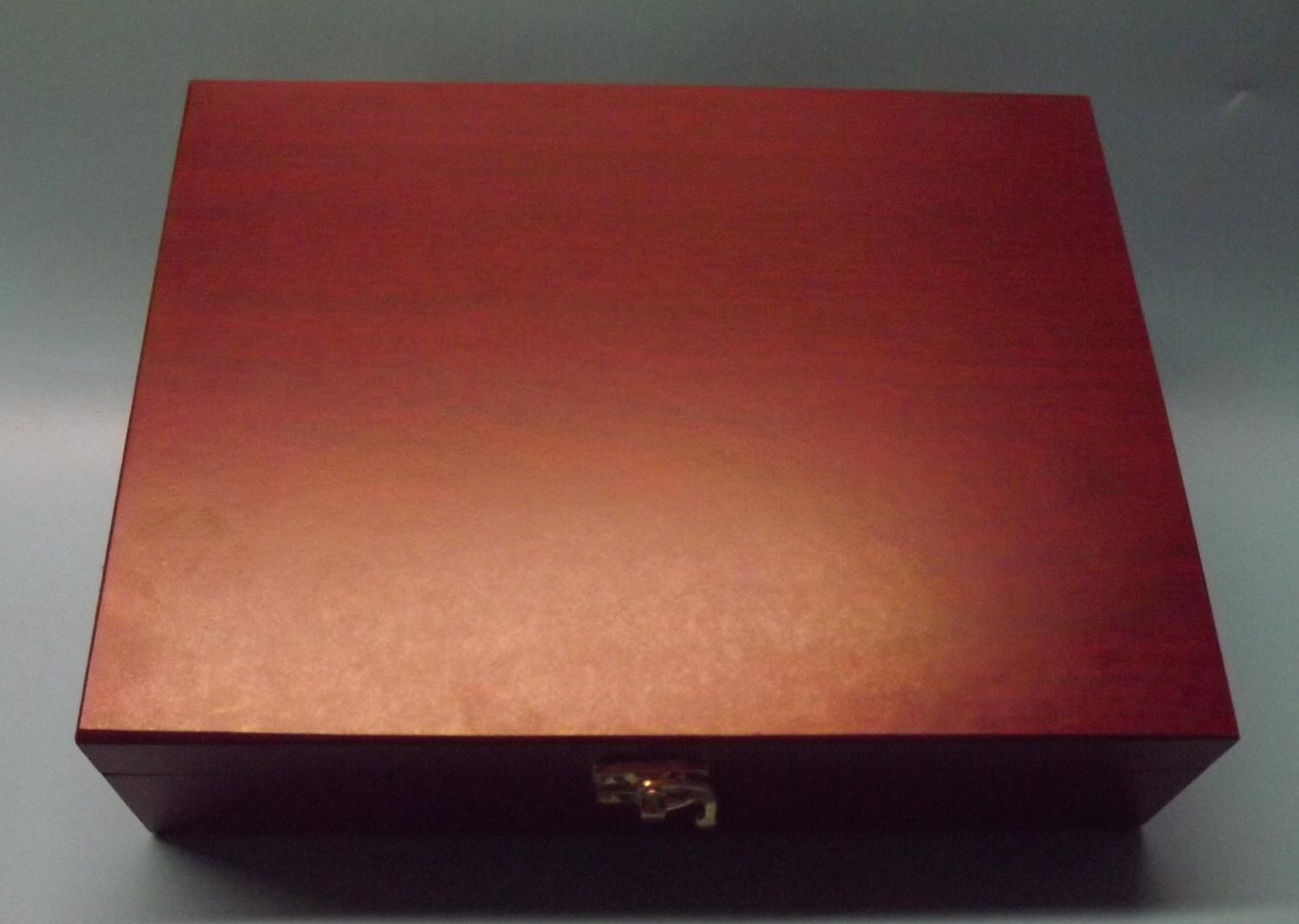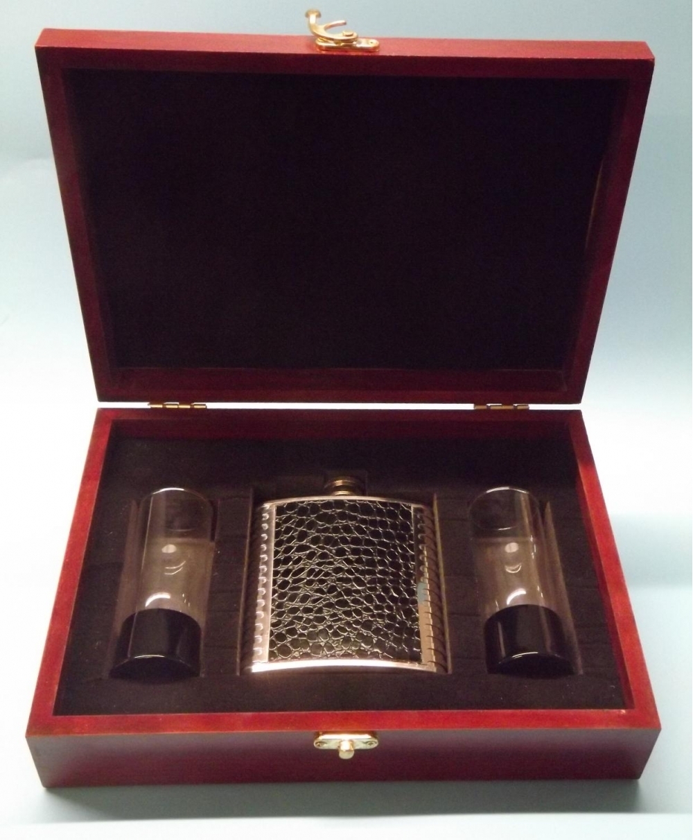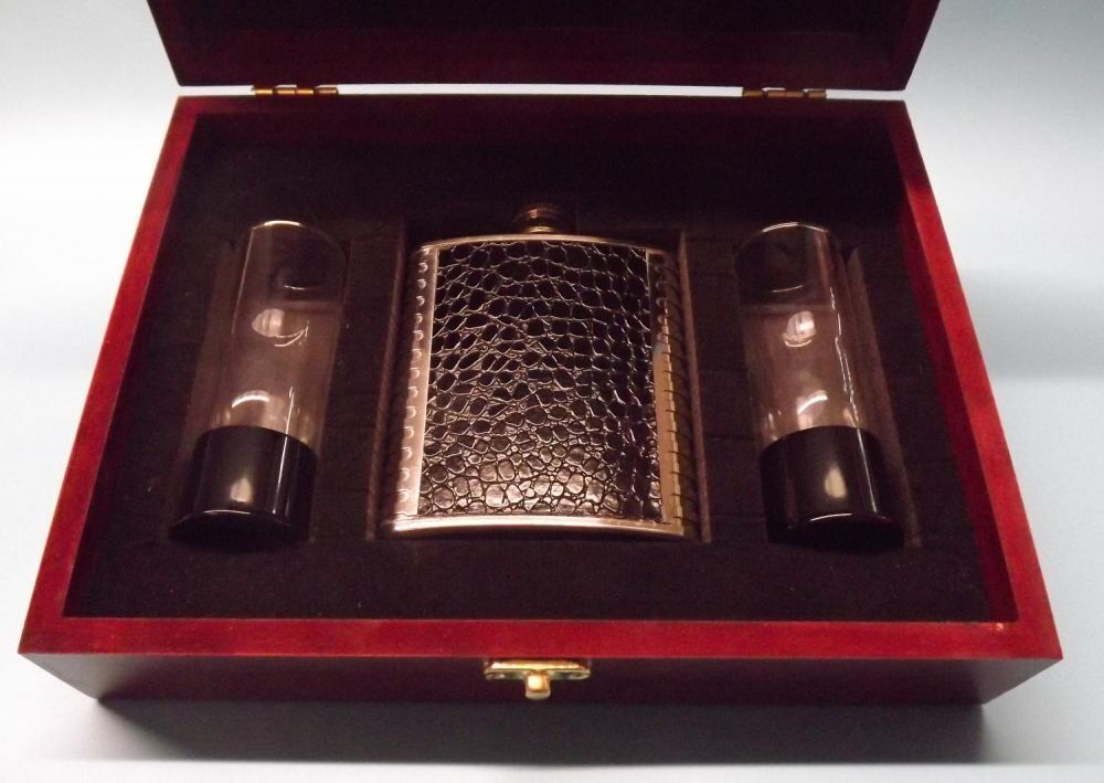 Mahogany coloured wooden gift box containing a 7oz Duplex stainless steel hip flask and 2 anodized black aluminium 2oz shot glasses,