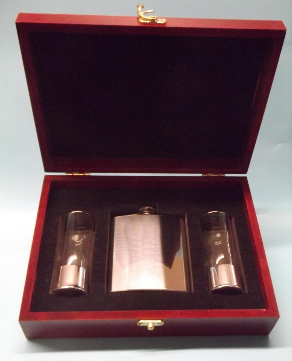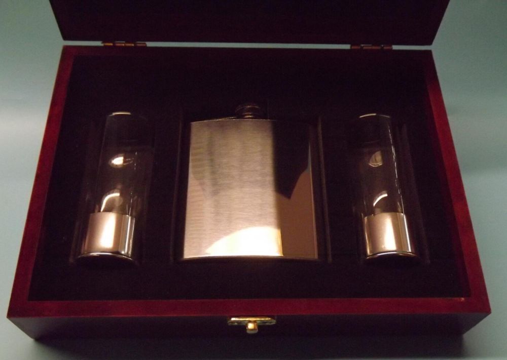 Mahogany coloured wooden gift box containing a polished 7oz stainless steel hip flask and 2 anodized silver aluminium based 2oz shot glasses,