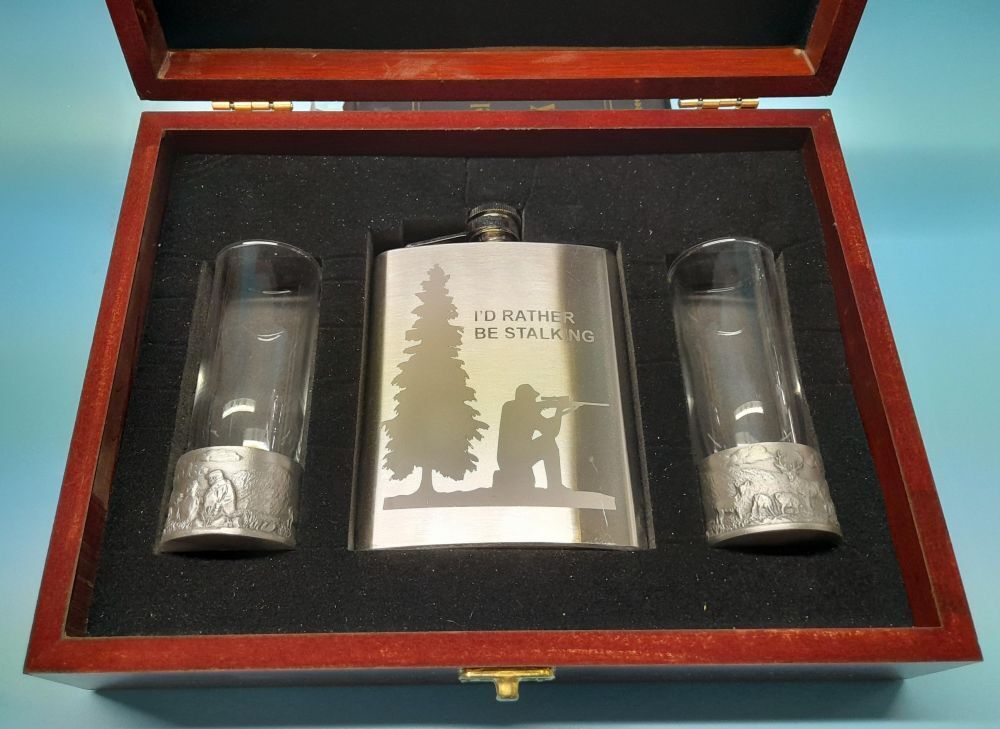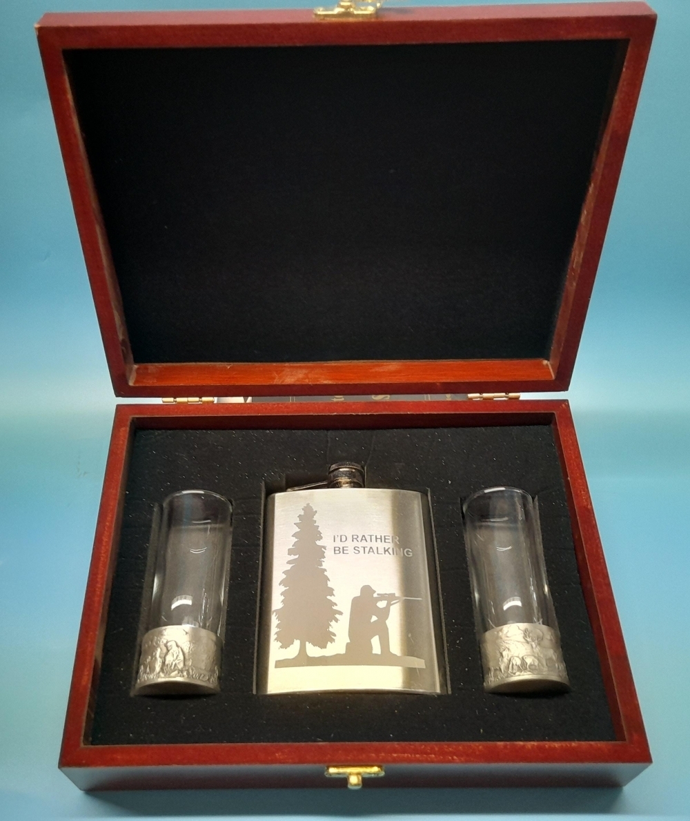 Mahogany coloured wooden gift box containing a brushed 8oz Engraved stainless steel hip flask engraved with a Stalker and the words "I'd rather be Stalking" along with 2 antiqued pewter stalking scene embossed 2oz shot glasses,