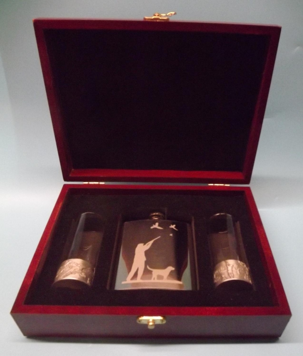 Mahogany coloured wooden gift box containing an engraved polished 7oz stainless steel hip flask ( shooting Scene) and 2 polished pewter shooting scene embossed 2oz shot glasses,