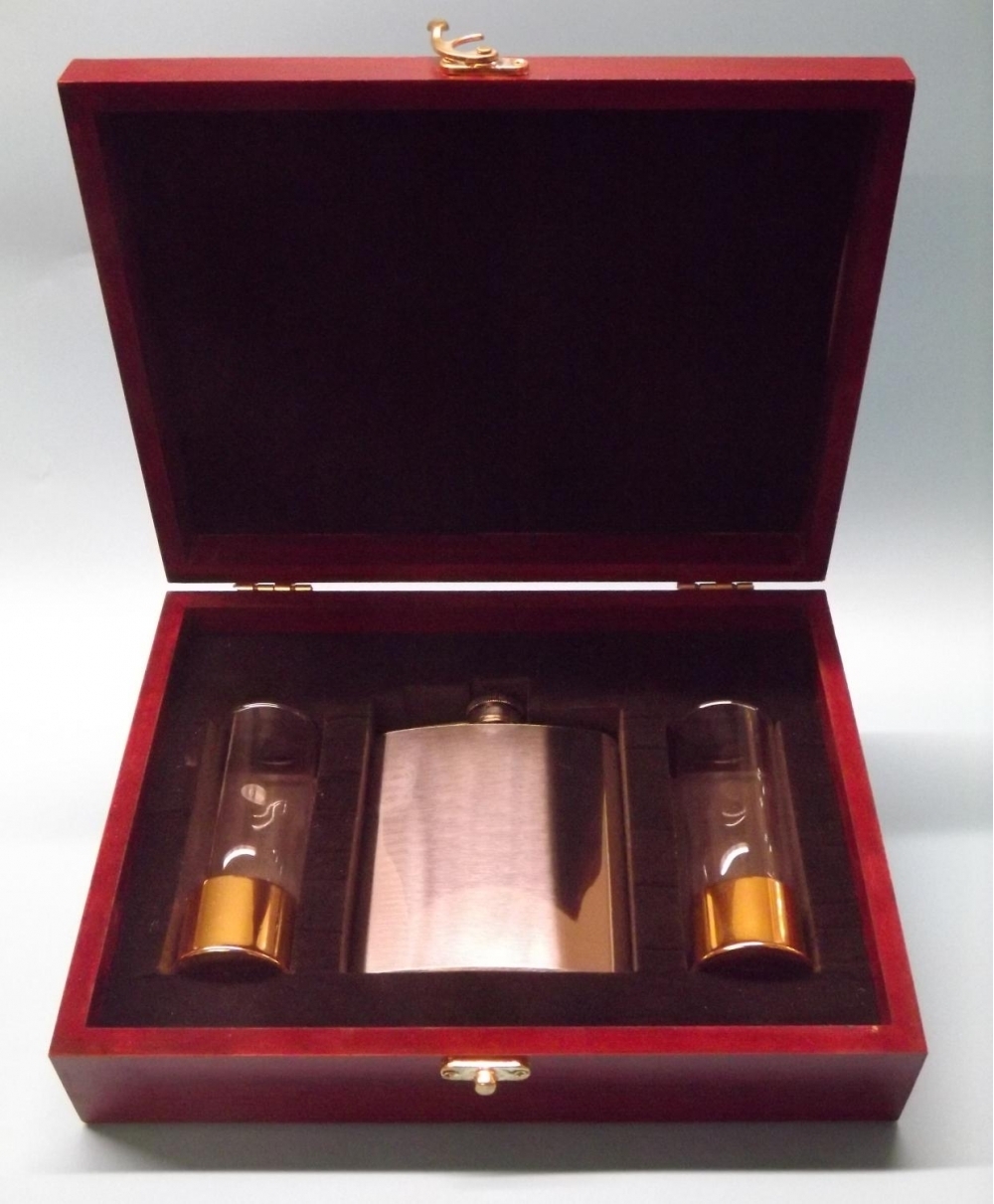 Wooden Gift boxed polished 7ozflask & anodized gold aluminium based shot glasses