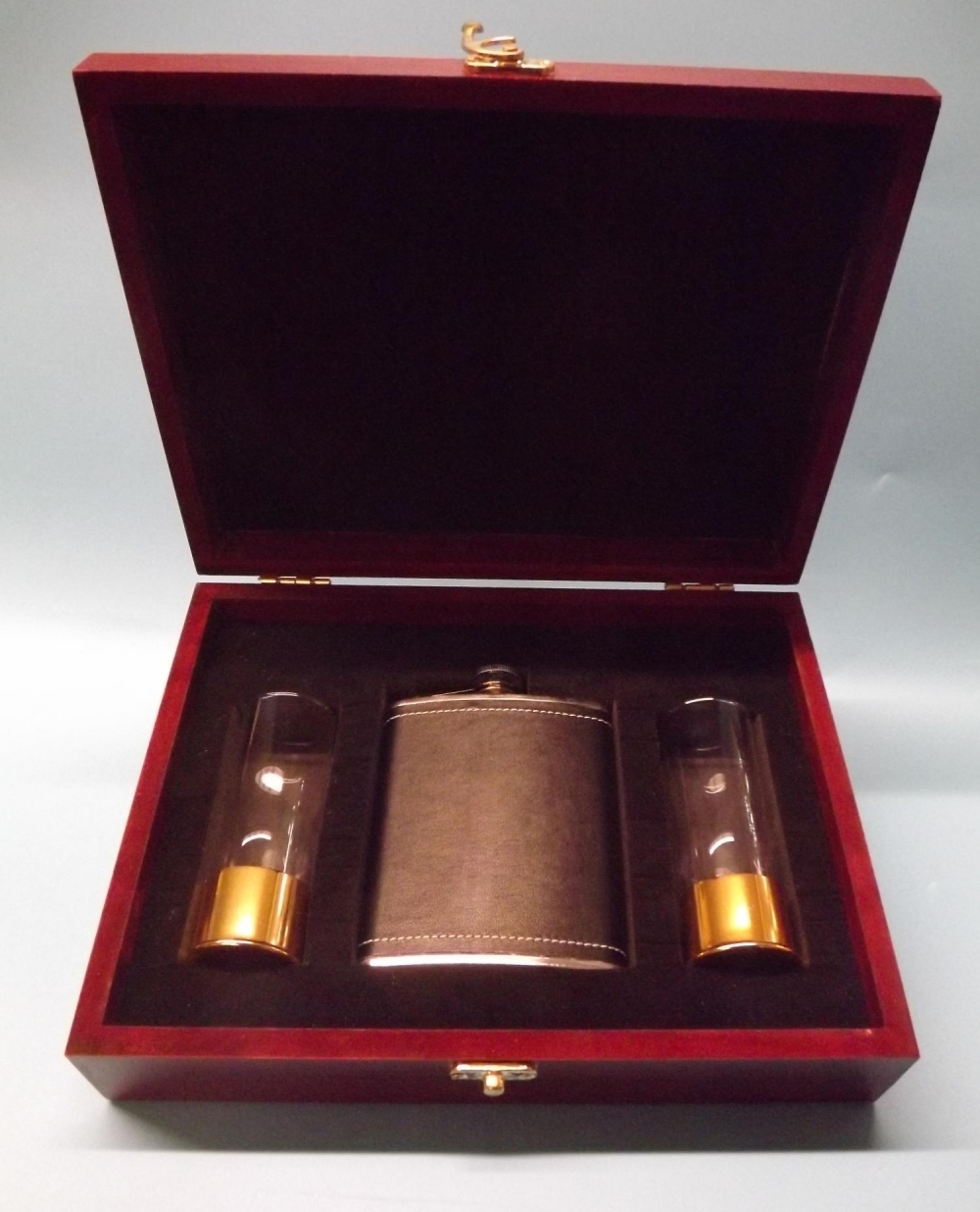 Mahogany coloured wooden gift box containing a simulated leather 7oz stainless steel hip flask and 2 anodized gold aluminium 2oz shot glasses,